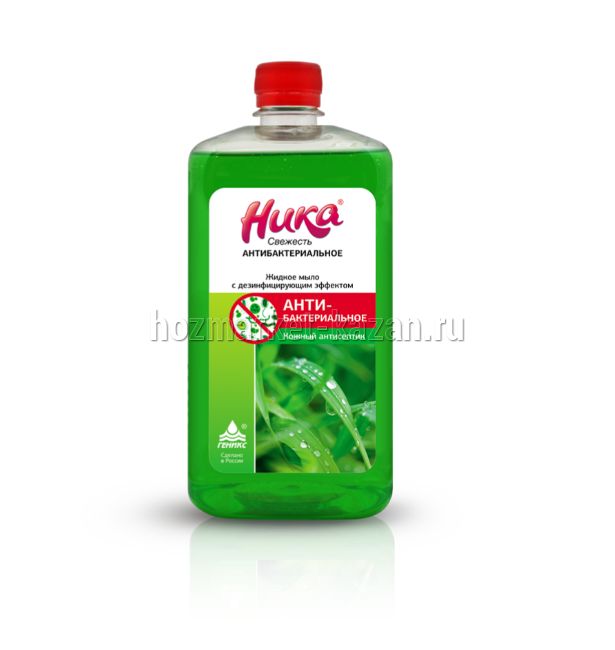 Ника Свежесть антибактериальное мыло жидкое дезинфицирующее, 1л.Мыло жидкое с дезинфицирующим эффектом «Ника-свежесть антибактериальное» представляет собой готовый к применению кожный антисептик в виде прозрачной вязкой жидкости светло-зеленого цвета.