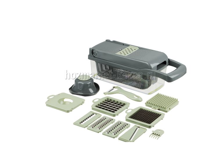 Овощерезка многофункциональная SATOSHI из 16 предметов "Мастер Слайсер" – это профессиональный кухонный помощник для идеальной нарезки овощей, фруктов и других продуктов. В комплекте 16 сменных насадок для различных видов шинковки, нарезки соломкой, кубиками и слайсами. Овощерезка значительно ускорит процесс приготовления любых блюд: супов, салатов и свежих и отварных овощей, вторых блюд, заготовок для заморозки. Набор также включает овощечистку, емкость с отверстиями для отделения жидкой фракции и пресс-ручка, которая защищает пальцы от повреждений. Корпус овощерезки и насадок изготовлен из прочного пищевого пластика, а металлические части и лезвия – из нержавеющей стали, устойчивой к коррозии и деформации. Все детали легко моются.