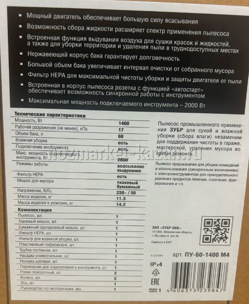 Строительный пылесос ЗУБР МАСТЕР модель М4-60, 60л, 1400Вт, сухая и влажная уборка, корпус из нержавеющей стали, розетка до 2000Вт ПУ-60-1400 М4 предназначен для сбора мусора на строительных площадках и в производственных помещениях. Он оборудован встроенной розеткой для подключения электроинструмента мощностью 100-2000 Вт. Бак емкостью 60 литров изготовлен из нержавеющей стали, что обеспечивает долгий срок службы. Благодаря функции выдувания можно избавиться от пыли в труднодоступных местах.